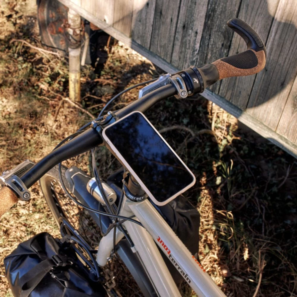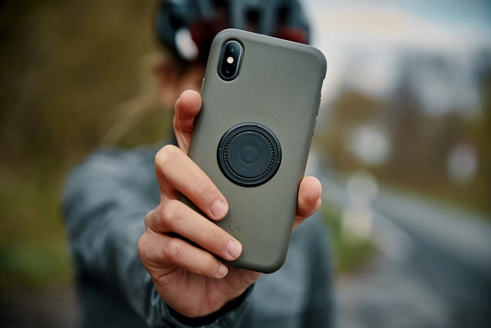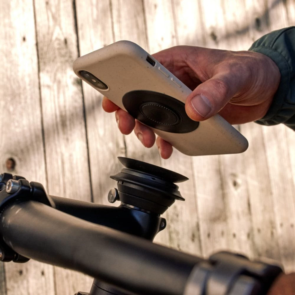 Dank der genial einfachen Verbindung aus Magnetkraft und Unterdruck ist das Smartphone mit einer Hand zu bedienen und um 360° drehbar, während eine Kugelrastung das Verdrehen während der Fahrt verhindert – auch auf Wurzeltrails!