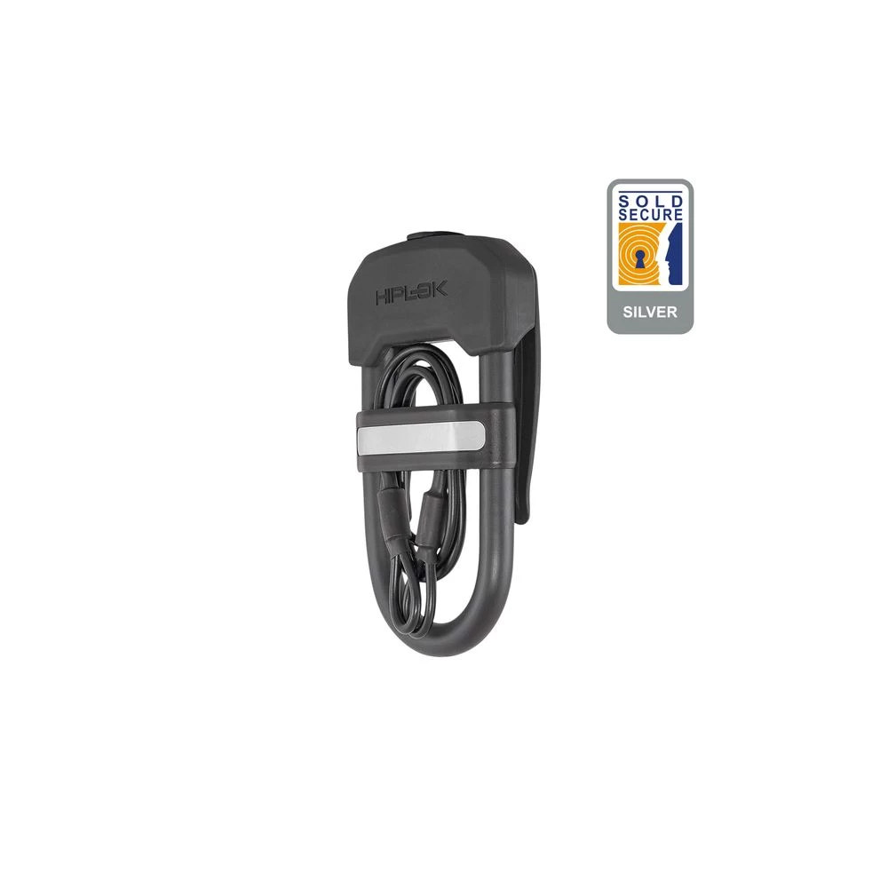 Das Hiplok DC besteht aus einem Bügelschloss mit hohem Sicherheitsstandard und einem zusätzlichen, 1 m langen Stahlkabel, das sich mit der beiliegenden Halterung in der Rundung des Bügels unterbringen lässt.