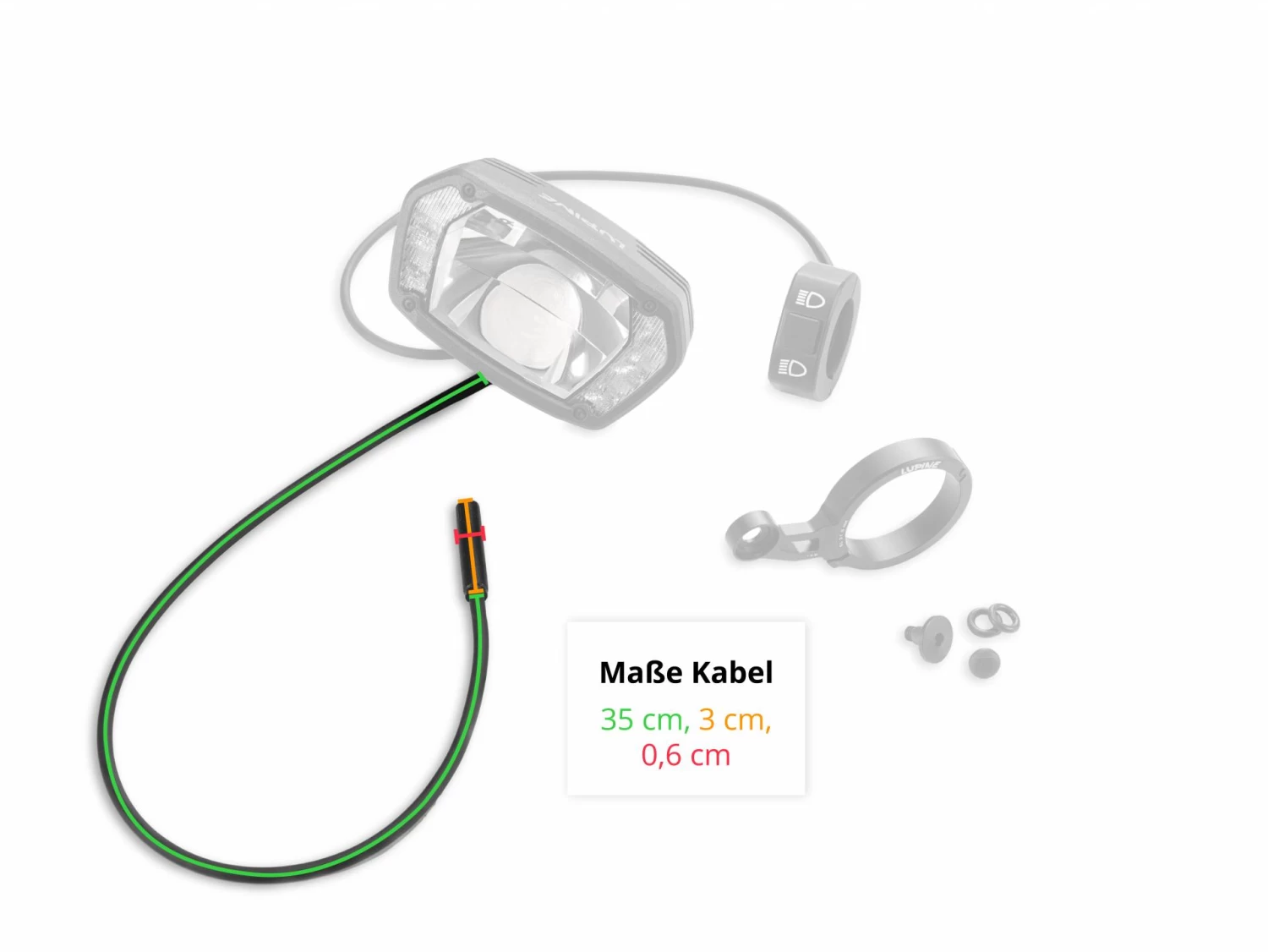 Lichtkabellänge 96,5cm (80cm + 16,5 cm), zusammen mit dem Kabel am Scheinwerfer ergibt sich eine Gesamtlänge von 1,33m.