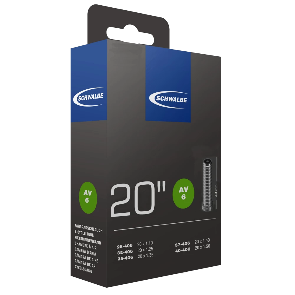 Schwalbe Standard Fahrradschlauch Nr. 6. Für Fahrradreifen in der Größe 20″ Zoll (ETRTO 28/40-406). Hält die Luft überdurchschnittlich lang.