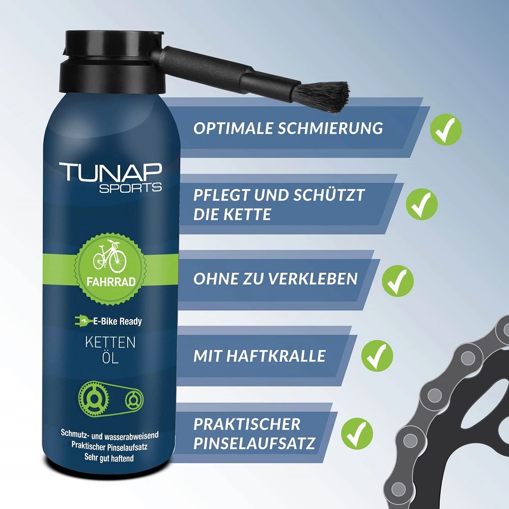 Das TUNAP SPORTS Kettenöl klebt aber nicht wie Kettenfett und alles bleibt sauber. Ein spezieller Haftzusatz für extreme Belastung verhindert das schnelle Abschleudern des Öls bei der Beschleunigung und sorgt lange für einen geschmeidigen Antrieb.